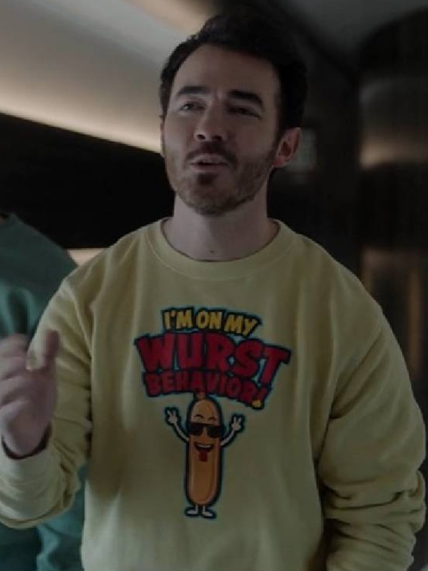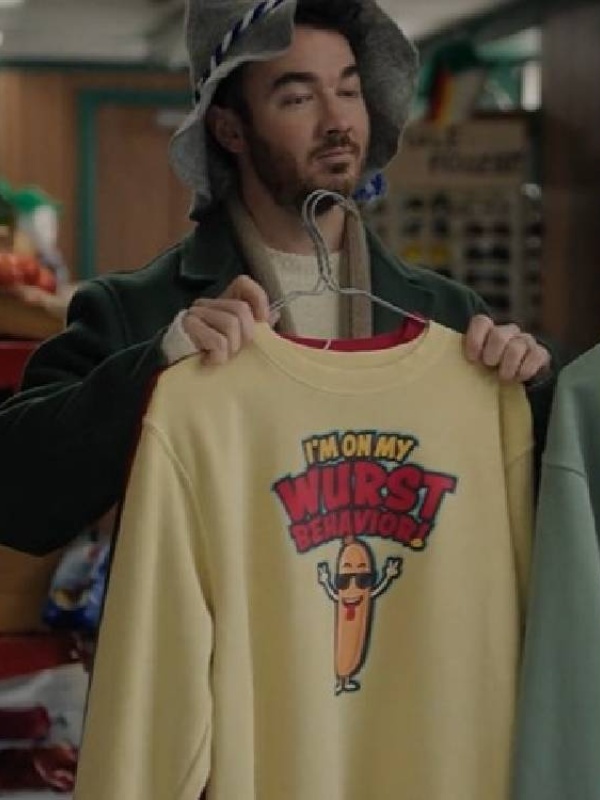 Furthermore, the article provides comfort, style, and seasonal charm evokes a festive fashion. Make yourself a fashion forward individual, wear this outfit with jeans and joggers. Also, a classic corduroy jacket is the best choice that takes your look to new heights. Add this unique piece to your collection and give yourself a new winter look that reflects the holiday spirit. The article, A Very Jonas Christmas 2025 Kevin Jonas ‘I’m On My Wurst Behavior’ Yellow Sweatshirt, is currently available. Grab it now!