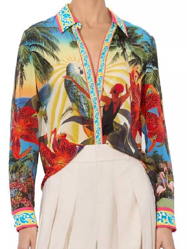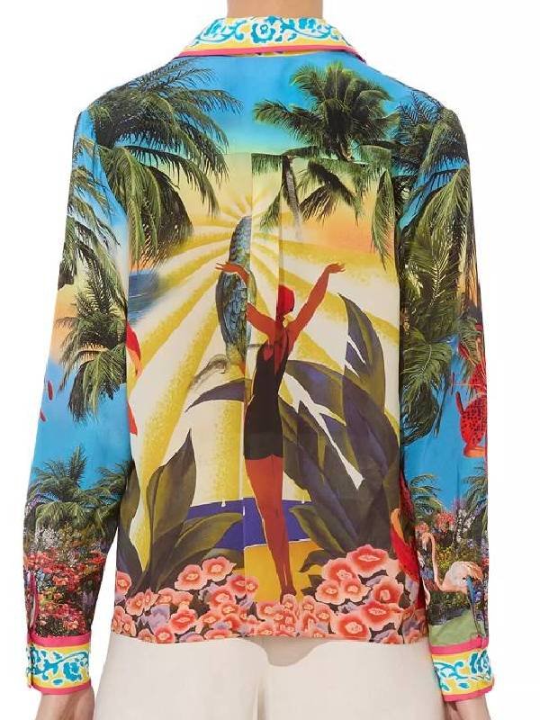 Television and movie admirers love great acting and emotion of the character that feels real. This is why fans love the top notch acting of Carrie Preston; she really brings something unique to the table. Beyond that, her show Elzbeth is also most watched. Moreover,the fans like her styling and dressing this makes the Carrie Preston Elsbeth S03 Tropical Printed Silk Blouse a must have for many.