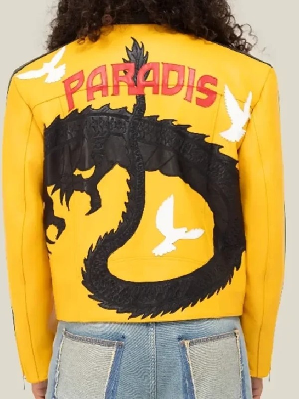 As we move ahead let us look at the design and specs of Dua Lipa Buenos Aires Black Dragon Yellow Leather Zipper Jacket. This breathtaking outerwear is crafted with real leather that gives a dynamic and bold look. Beyond that, this apparel features a yellow color theme and a bold graphic print making it look cool and classy, Try it out now to look smart and dashing.