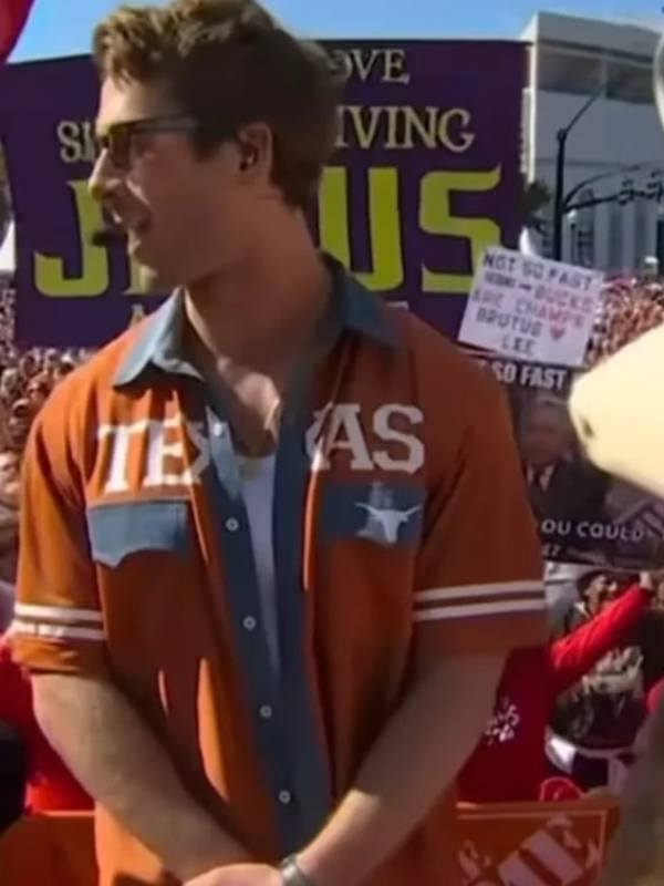 Also, it is a fusion of sport heritage and street fashion. Stitched with pure cotton materials, it keeps you relaxed, calm, and effortlessly comfortable. The outfit ensures long-term durability while maintaining its timeless elegance. Comes in vibrant colors and has multiple sublime features, which is worthwhile. So get Glen Powell Kristin Juszczyk Texas Longhorns Shirt – Orange/Blue  right now. The article proves that it is not specifically crafted for the sideline but can revamp your fashion game in just one go! Pair this article with a plain tee, cargo pants, and white sneakers. A subtle, understated, and celebrity-worthy outfit is ready to be added to your wardrobe.