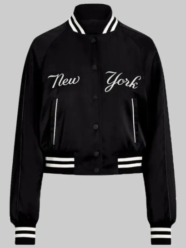 Moreover, the effortlessly stylish piece, that mirrors her attractive, fashionable and charismatic personality. The outfit roars the baseball team spirit while it comes with a twist of modern elegance which perfectly balances the silhouette. Furthermore, made up with the top tier quality satin fabric, intricately lined a soft viscose lining. It keeps you comfortable while assuring durability. Perfect to pair it with a turtleneck, fitted jeans and ankle boots, a perfect outlook that commands attention. So hurry up before it’s gone, shop this Recreated – Singer Shoshana Bean New York Yankees Black Satin Starter Jacket. Transform yourself into a baddie look.