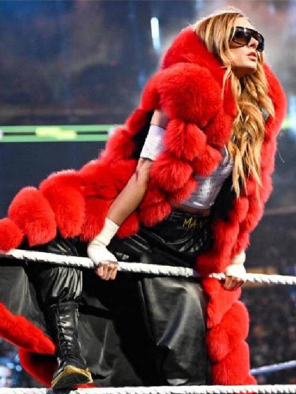 WWE Pay-Per-View 2025 Rebecca Quin Red Fur Long Vest